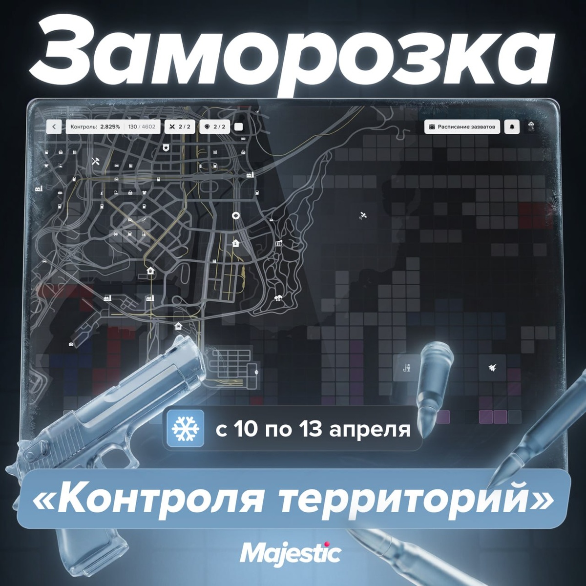 После рестарта 10 апреля карта квадратов будет заморожена. Мы видим ваши просьбы и увеличиваем вместимость покупных складов в два раза до 17 апреля включительно. 👇 Ключевые даты: • Заморозка продлится с 10 по 13 апреля включительно. • 14 апреля все территории станут нейтральными. • Предметы со складов особняков и предприятий будут удалены 14 апреля — не забудьте заранее перенести вещи. 📞 Сейчас самое время, чтобы накопить силы, сформировать составы и продумать стратегии до мелочей. ❤️ Majestic | ВИКИ