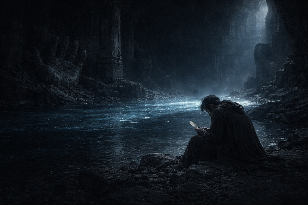 Под безмолвным взглядом шестипалых статуй и кристально-крылатых богов, в огромной древней каверне, у реки, сиявшей как тёмный сапфир, раздался тихий, горький плач. Иллан сидел на берегу чёрной подземной воды и плакал, как осиротевший ребёнок, оплакивая не только утраченную невинность, но и тот малый, понятный мир, к которому уже не сможет вернуться. И камень, и вода, и древние безмолвные изваяния словно принимали этот плач в себя, как первую дань, принесённую им живым сердцем.