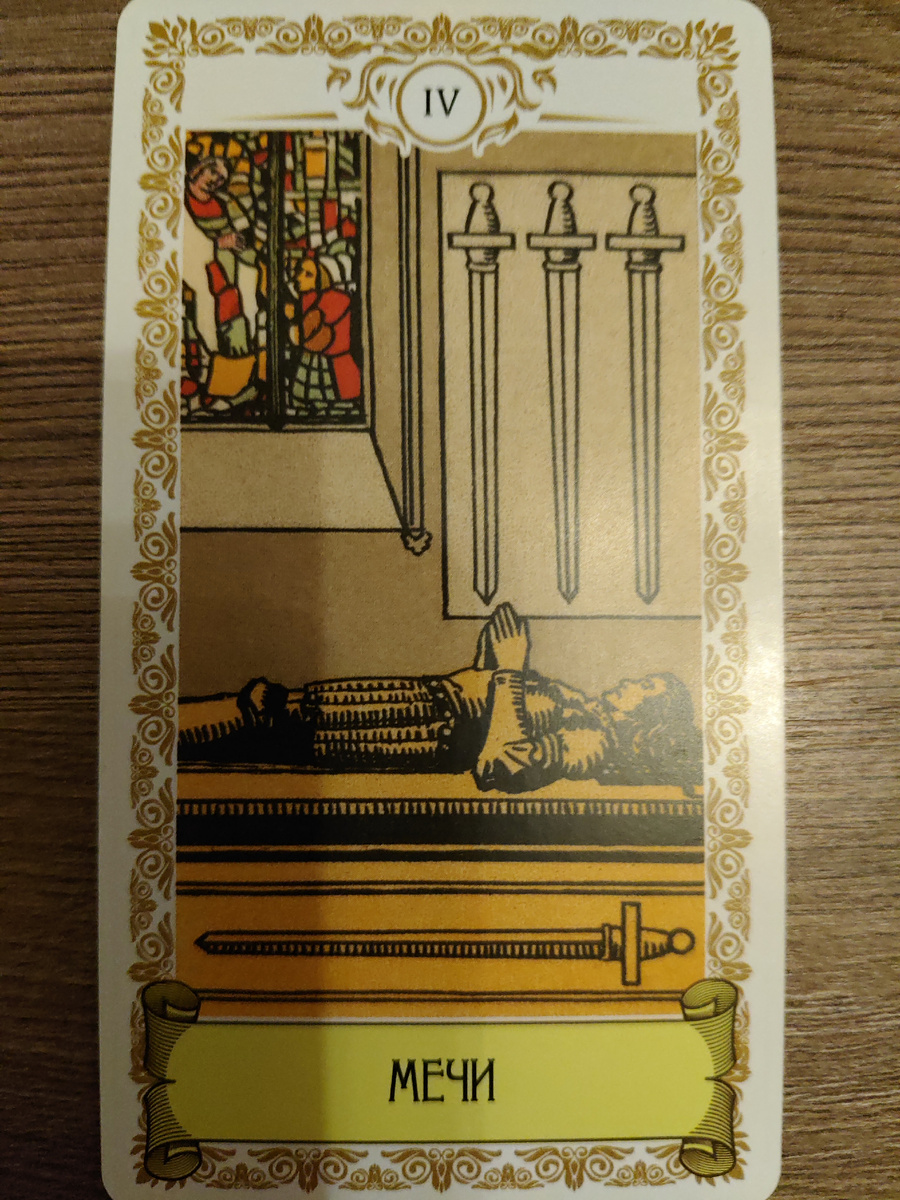 Эта карта также указывает на возможность обретения ясности через уединение и размышления. Время, проведенное в тишине, медитации или просто в спокойном созерцании, поможет вам взглянуть на ситуации с более ясной перспективы, отделить важное от второстепенного и найти решения, которые были недоступны в состоянии спешки. Четыре Мечей призывает к заботе о себе, к пополнению своих внутренних ресурсов, чтобы с новыми силами и ясностью ума встретить грядущие события.