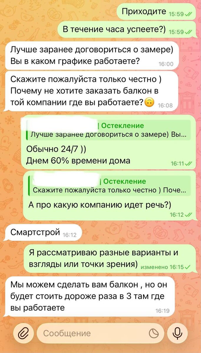 Ситуация смешная, сейчас печатаю эти строки и думаю, но слили же потенциального клиента и зачем выпендриваться. На днях остеклил балкон и решил узнать, сколько будет стоить утепление. Написал просто как клиент — пригласить на замер, посмотреть цены, сроки, разные подходы. И что вижу: — «Почему не хотите заказать там, где вы работаете?» — «Мы сделаем, но будет в 3 раза дороже, чем там» Понимаете, вот так у многих устроены продажи. И часто клиенты не доходят до следующего этапа переговоров. Не попытались разобраться: — что именно мне нужно — какой бюджет — какие варианты ремонта, не знаю.. но много вопросов, даже если там какие то жалкие 6 метров. Придумали какую то красивую историю про меня. Если кратко, я их знаю, слежу за ними, когда то предлагал им свои услуги, они меня меня знают. И вот настал момент, когда уже мне нужны их услуги. Но они решили начать с допроса, хотя я обычный клиент в этом диалоге. Да, я маркетолог. Да, веду проект в этой нише. Но покупаю я как человек,
