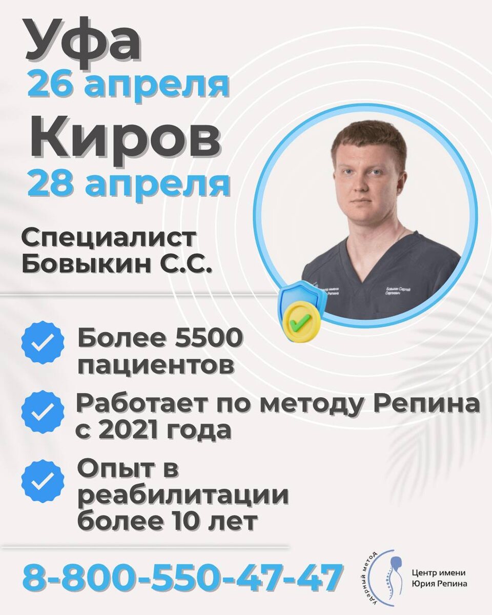 Друзья, по вашим заявкам добавили еще два города: 🔹 26 апреля — УФА 📍 Адрес: г. Уфа, ул. Бакалинская, д. 33/2, салон «My space» (кованный вход с торца зелёного дома, дом напротив входа в ТЦ «Ультра») 🔹 28 апреля — КИРОВ 📍 Адрес: г. Киров, ул. Воровского, д. 119, 2 этаж, офис 201 (при визите уточнить, что в учебный класс, далее проводят, коворкинг «Бьюти-парк Косметичка») Приём ведёт специалист Бовыкин Сергей Сергеевич — Более 10 лет опыта, участник научных исследований, аспирант МГУ — Более 5500 человек уже получили помощь — Работает с острыми и хроническими болями — Восстанавливает подвижность и убирает причину боли ❗️Выездной приём — это всегда ограниченное количество мест Если вы давно откладывали — лучше записаться сейчас 📩 Записаться на приём: http://n458139.yclients.com/ 📩 Можно написать нам и получить консультацию: — отправить МРТ — описать симптомы — задать любой вопрос 🔥 Если вашего города нет Мы открываем новые направления, когда видим, что нас ждут 👉 Остав