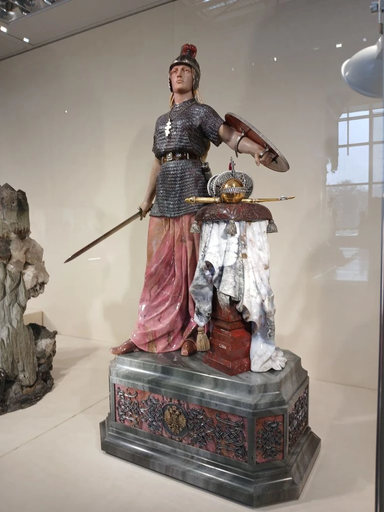 Мой проводник и сказитель подвёл меня к витрине, где стояла прекрасная статуя, олицетворяющая нашу Россию. Эта замечательная статуя нам, уральцам, хорошо знакома. Её первый вариант по модели скульптора Николая Лаврецкого украшает Каслинский чугунный павильон, находящийся в этом же зале. В 1900 году на Всемирной выставке в Париже наш павильон получил золотую медаль,а скульптура была особо отмечена тогдашним президентом Франции. Сейчас же наши мастера сделали это произведение в каменном варианте и, безусловно, облик статуи получился красочным и более живым, чем чугунный оригинал. Великолепный величественный образ. Настоящее олицетворение нашей богатой и славной Истории! Россия- хранительница, кормилица и воительница. Какие богатства она имеет в своих недрах, не перечислить. Поэтому и не выпускает оружия из своих сильных рук и в