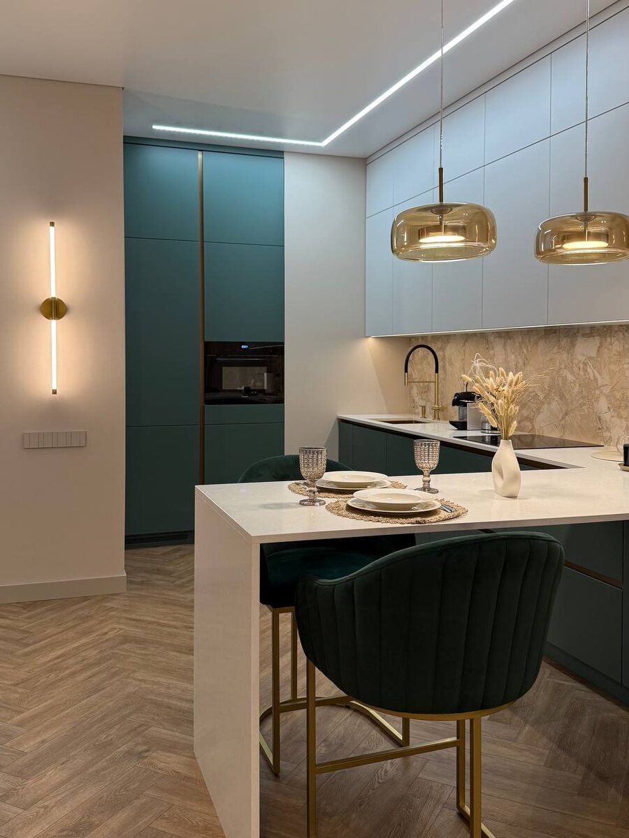 ? Обои на фартуке?😱 Да, так можно! Решения далеко не универсальные, но при большом желании заказчика и правильном выборе покрытия — почему бы и нет? Продолжаю о квартире 53 кв. м в ЖК Will Towers на юго-западе Москвы. По напольному покрытию. Изначально здесь планировалась укладка инженерной доски. Но при всех плюсах, у нее есть и достаточно существенные минусы — она боится воды, перепадов влажности, требует ухода и реставрации. Для кухни и прихожей достаточно рискованное решение. Что же выбрали на замену? SPC-ламинат от Alpine Floor (8 мм). Не менее выигрышный по визуалу, при этом более практичный вариант в данном случае. Но это еще не всё…