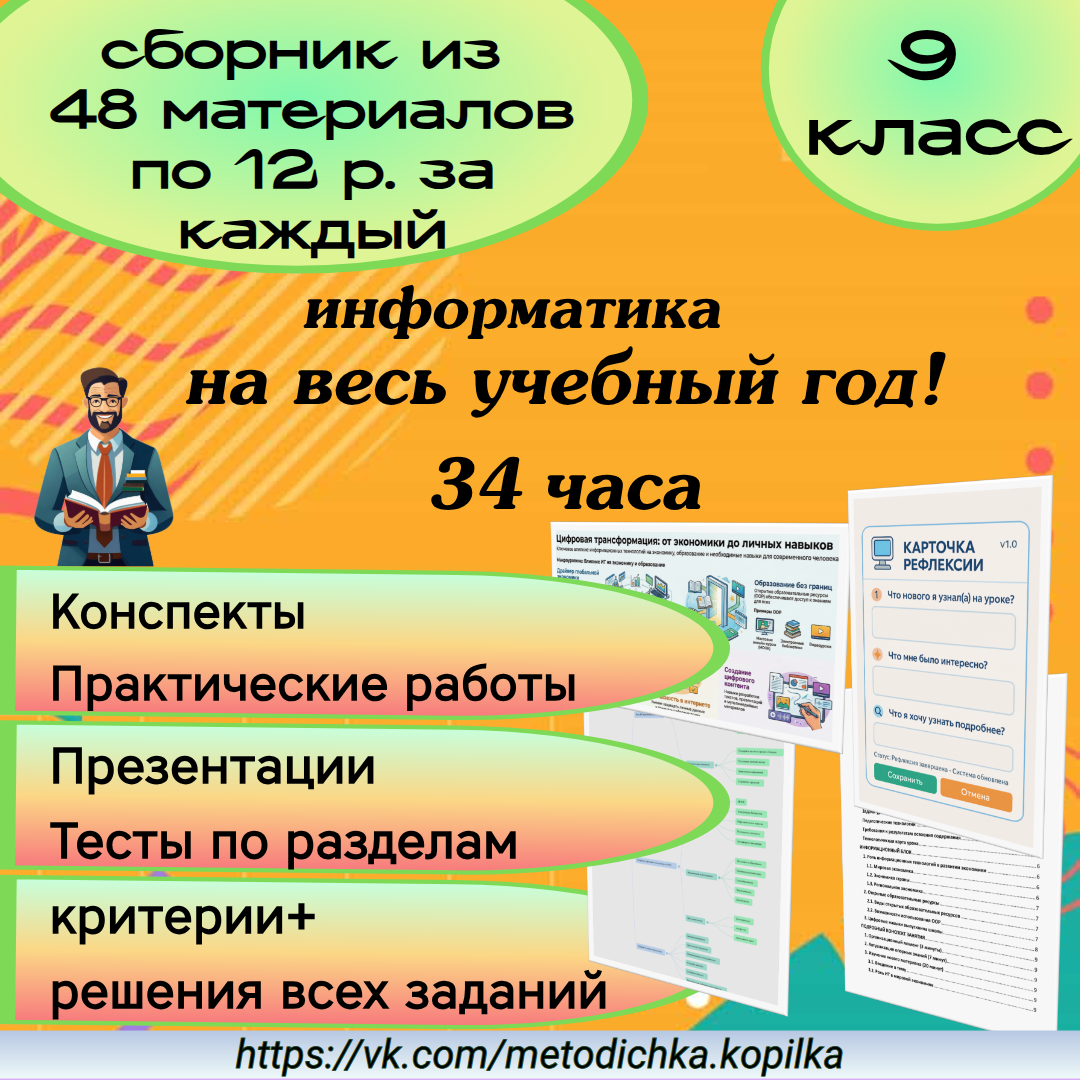 • Полное соответствие образовательным стандартам и адаптация под разный уровень обучающихся. Сейчас действует скидка 50% на сборник «Информатика. 9 класс. Комплект материалов на весь учебный год». Это возможность получить готовое методическое решение без компромиссов в качестве. Материалы по разным направлениям доступны на сайте ГотовУрок.рф. Подписывайтесь, ставьте лайк, обсудим в комментариях — Ваш опыт важен для сообщества педагогов. Ваша Методичка (ГотовУрок.рф) на других ресурсах: