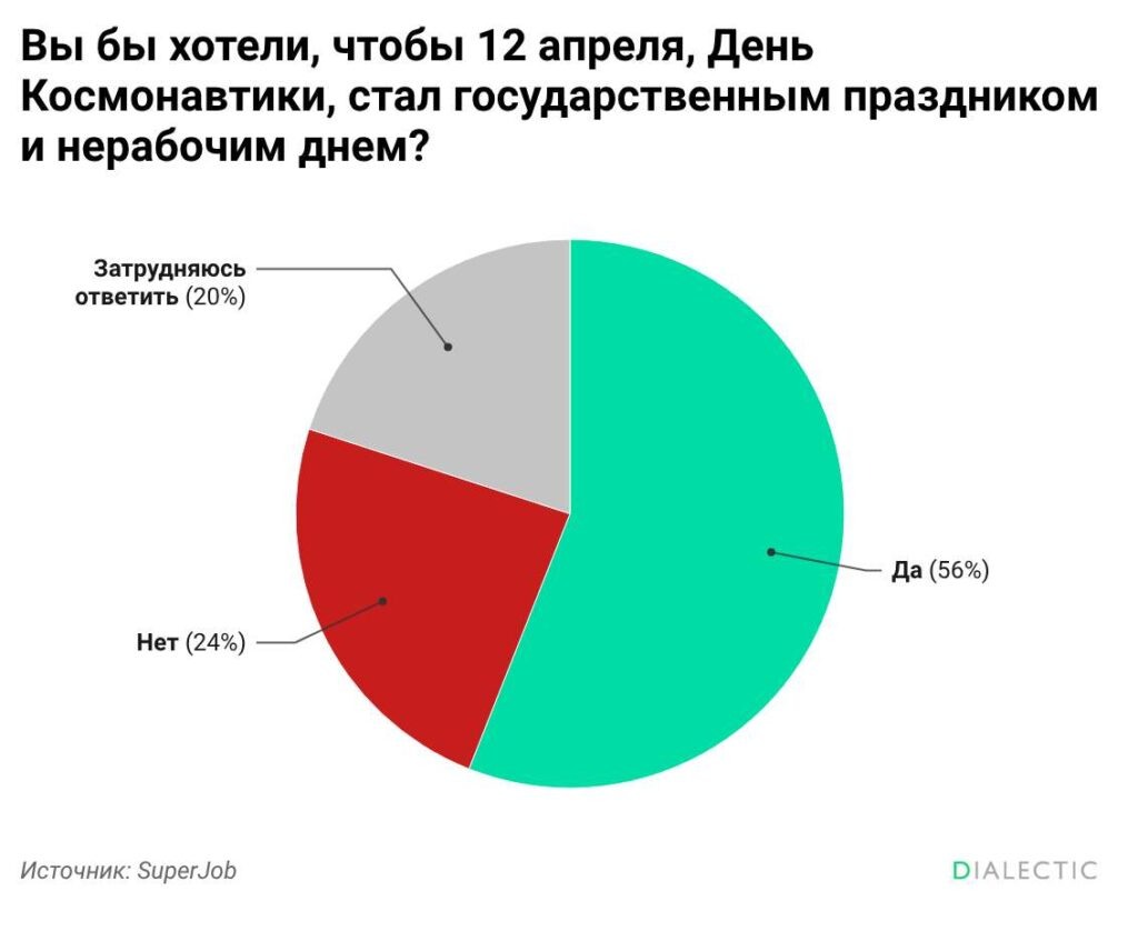 Более половины россиян выступают за то, чтобы 12 апреля стал государственным праздником и нерабочим днём. Как показал опрос Исследовательского центра SuperJob, такую идею поддерживают 56% экономически активных граждан старше 18 лет. Против высказались 24% респондентов, а 20% затруднились с ответом. Женщины чаще мужчин одобряют предложение — 58% против 53%. Среди молодёжи до 34 лет поддержка достигает 64%, тогда как в возрастной группе 45 лет и старше она составляет всего 43%. Респонденты со средним профессиональным образованием голосуют «за» чаще, чем обладатели высшего образования — 59% против 53%. Сторонники идеи ссылаются на национальную гордость и важность подчёркивать достижения страны в космосе. «Это наша гордость», «символ высоких технических достижений», «память о гениальных инженерах и самоотверженных храбрецах» — такие формулировки звучали чаще всего. Противники в основном говорят об экономических последствиях: меньше рабочих дней означает меньше зарплаты. Ранее было выяснено