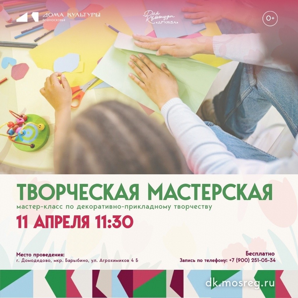 🎨 Мастер-класс по декоративно-прикладному творчеству. 🚫 Возраст: 0+ 📆 11.04.2026🕒11:30 🏢 Городской дом культуры «Дружба» 📍 г.о. Домодедово, мкрн.Барыбино, улица Агрохимиков, д.4Б 💰 Вход свободный❗️ ✅ Мероприятия Домодедово https://dzen.ru/id/66f10385cc4c5a16f7b5fb02 https://vk.ru/domodedovo_events http://dzen.ru/domodedovo_events