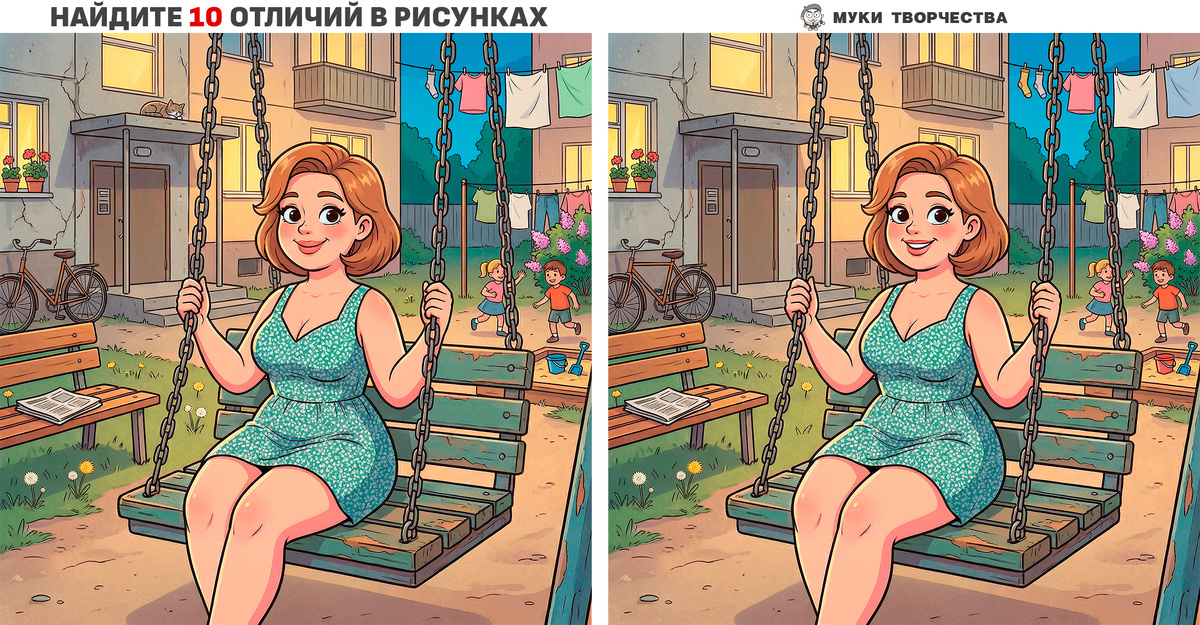 Тёплый вечер во дворе… Качели скрипят, в окнах уже зажёгся свет, где-то смеются дети, а на лавочке забыли газету. Кажется, всё знакомо до мелочей. Но это только на первый взгляд. Я спрятал здесь 10 отличий, одно отличие, кстати, находят единицы. Горизонтальный вариант: Тёплый вечер во дворе... Вертикальный вариант: Тёплый вечер во дворе... ОТВЕТ-ПОДСКАЗКА: Сколько получилось у вас? Напишите в комментариях 👇