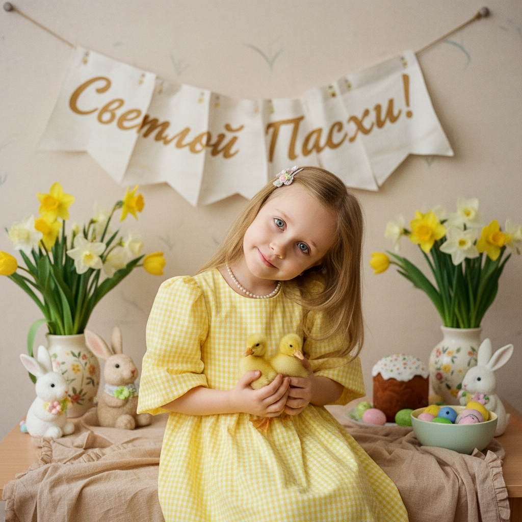 Кинематографический эффект с добавлением зерна На переднем плане маленькая девочка 4 года в ярко\-желтом платье в клетку с рукавами\-фонариками сидит на светло\-коричневой ткани с легким рюшем\. Платье с белыми клеточками выглядит жизнерадостно, а девочка, нежно держа двух утят, слегка наклоняет голову, улыбаясь\. На её шее — светлый жемчужный браслет, а в волосах — маленькая заколка с цветочком, что придаёт ей невинный, нежный вид\. Вокруг неё весна: на заднем плане висит тканевый баннер с надписью «Светлой Пасхи\!», выполненный простым шрифтом\. По бокам композиции расположены живые цветы — нарциссы и тюльпаны в вазах, которые добавляют яркости и свежести\. На столе рядом с девочкой стоят декоративные пасхальные фигурки кроликов и яиц, а также пасхальный кулич с глазурью\. В пастельной тарелке аккуратно лежат декоративные яйца, создавая атмосферу уюта и праздника\. Всё окружение выполнено в теплых пастельных оттенках, с мягким светом, котор