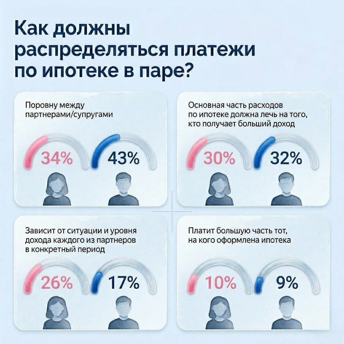 - 10% женщин и 9% мужчин отметили, что платить больше должен тот, на кого оформлена ипотека.
