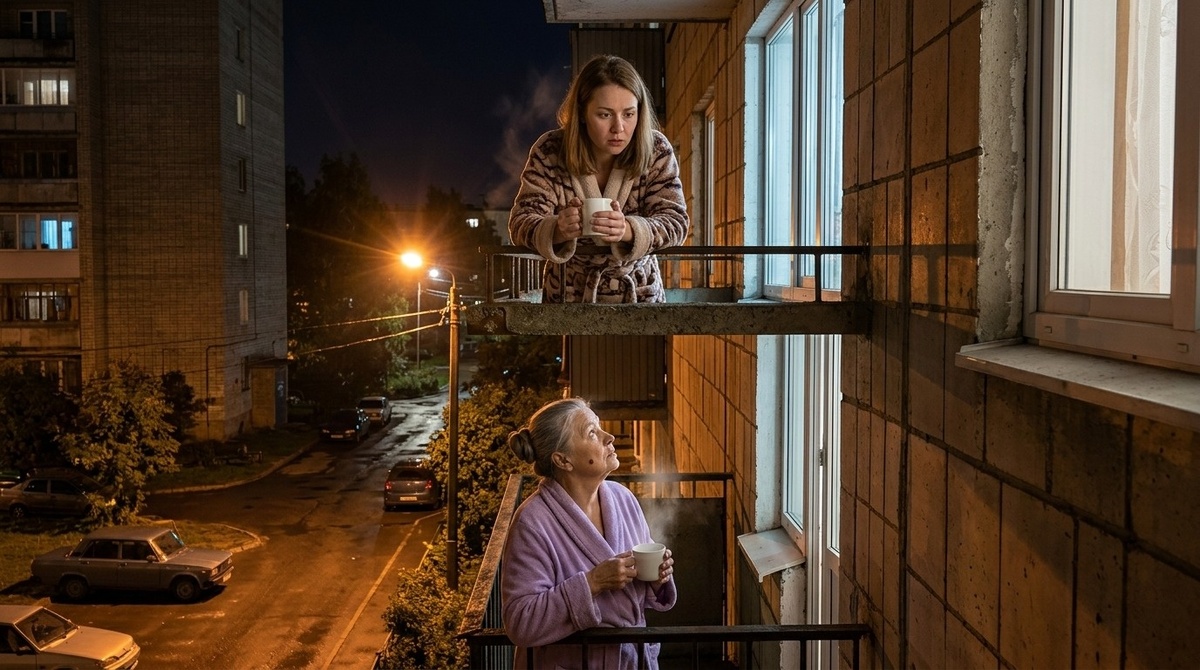 В ту ночь она вышла на балкон с двумя кружками. Как обычно. Соседка уже стояла внизу. Ирина посмотрела на неё сверху — сиреневый халат, седой пучок, кружка в руке.