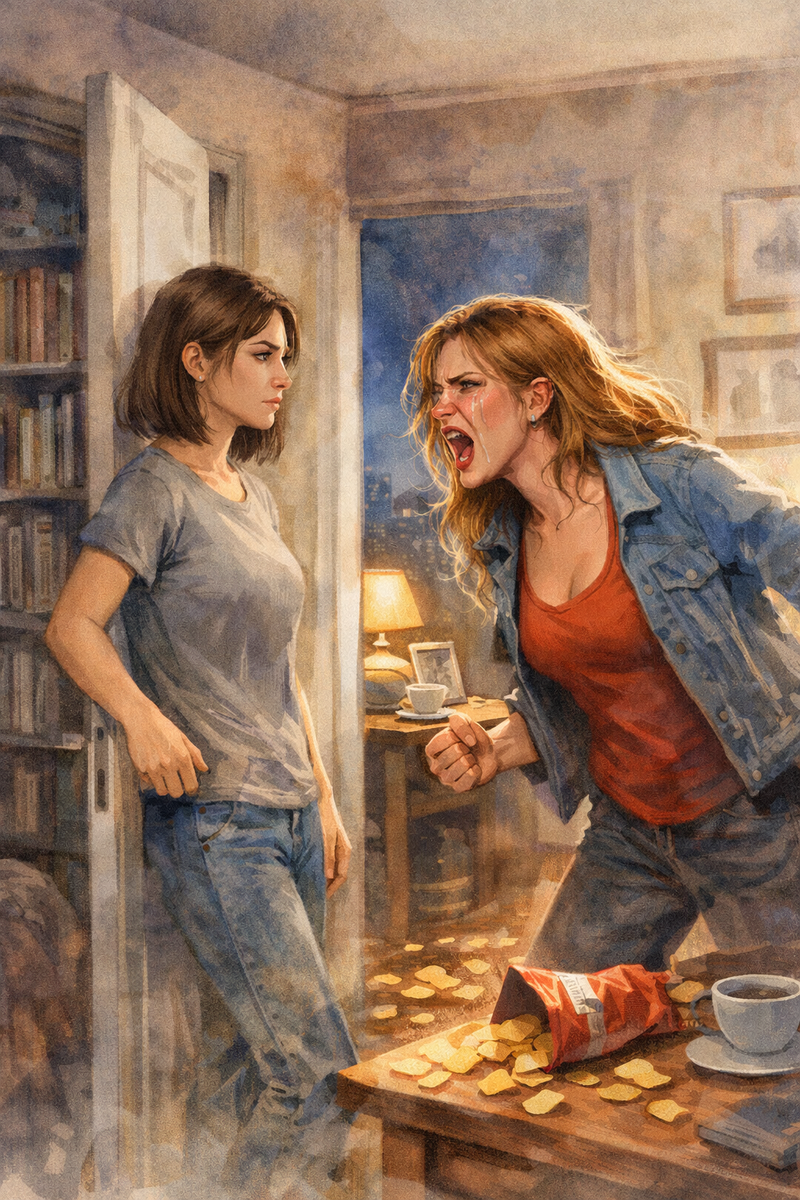 — Ты... Ты с у к а! — крикнула она, вскакивая с кровати. Чипсы разлетелись по полу. — Я всю жизнь! Мы же вместе! Какая же ты мерзавка!