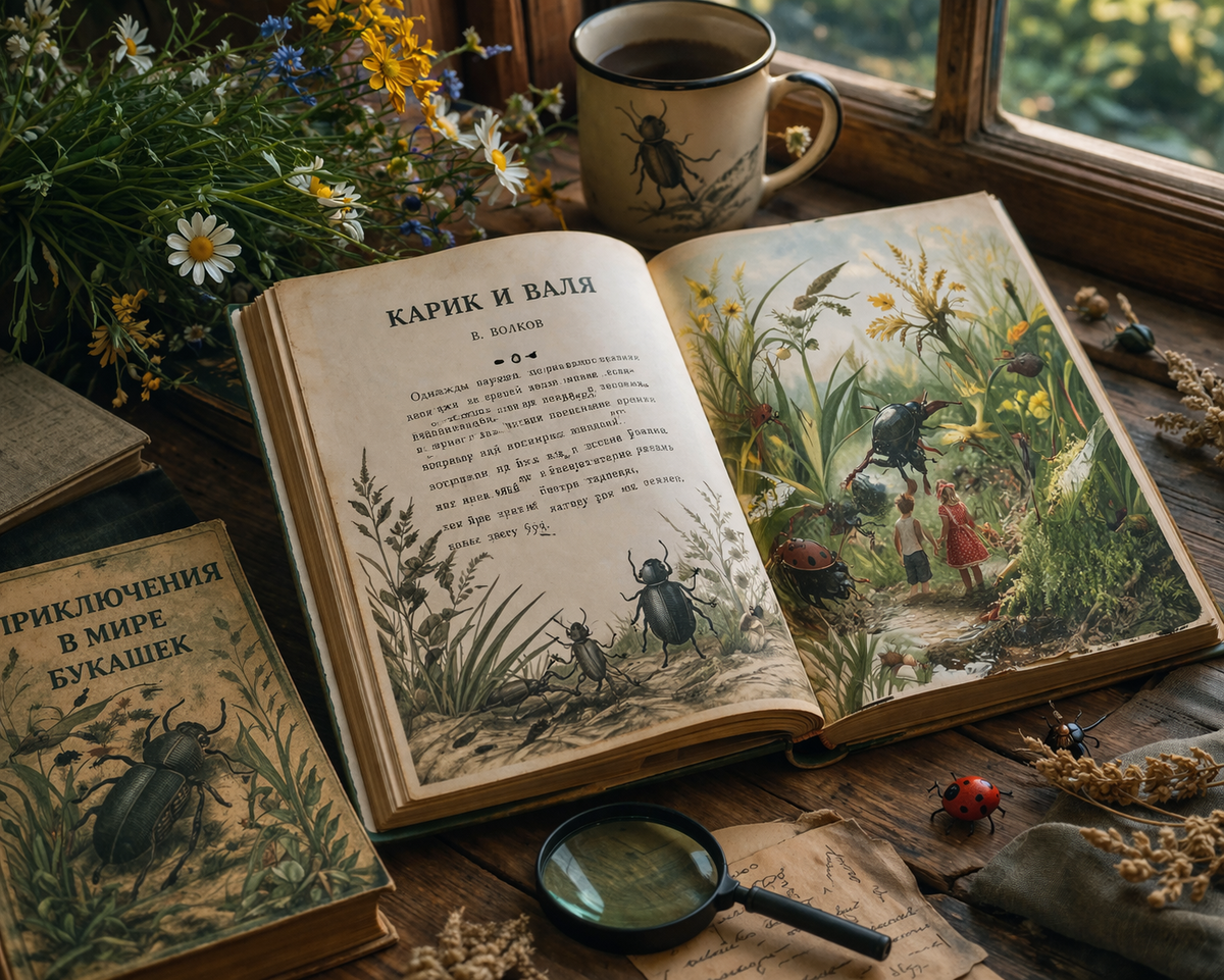 Иногда кажется, что детские книги запоминаются не сюжетом, а ощущением - как пахло летом, когда ты их читал, как скрипели половицы, как на подоконнике гудела настоящая муха. И вдруг однажды ты возвращаешься к этим историям уже взрослым и понимаешь: дело было не только в ностальгии. В этих книгах спрятано куда больше, чем казалось тогда. Есть особый тип детских сюжетов - тихие приключения, происходящие буквально под ногами. Мир букашек, травинок, капель росы. Он не требует космических масштабов, потому что сам по себе уже бездонный. Первая такая история - про Карика и Валю. Она начинается почти буднично: дети, лето, случайность. Никакой торжественности. Но именно в этом и есть странная правдоподобность происходящего. Они уменьшаются - и не просто оказываются в фантастическом мире, а попадают в реальность, которая вдруг стала слишком большой. И вот тут происходит главное. Трава перестает быть фоном. Она становится лесом. Капля воды - не просто капля, а тяжёлое, почти живое тело, которое
