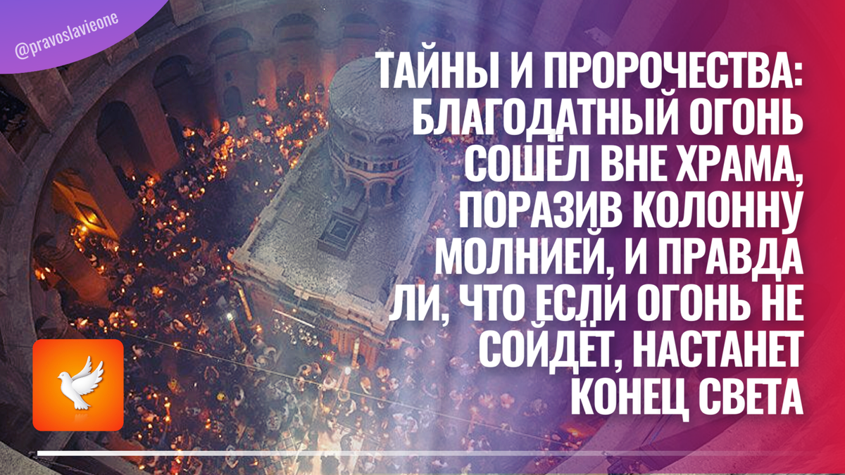 «...День был ясным и погожим. Патриарх занимал место по правую сторону. Вдруг прогремел гром, и мраморная колонна посередине слева треснула — из трещины вырвался пылающий Огонь».
