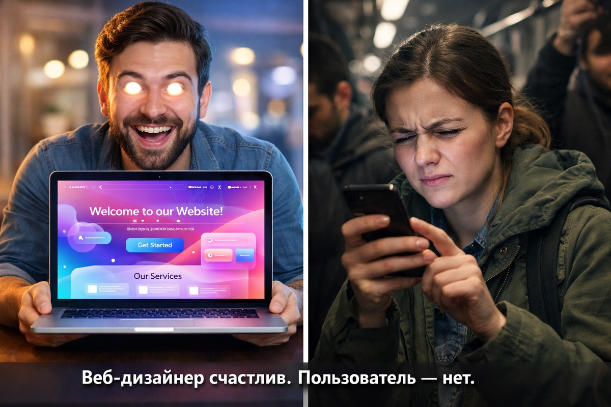 Реальный кейс из практики: интернет-магазин одежды, редизайн с нуля. Дизайнер сделал шикарную визуальную систему — тёмный фон, крупные фото, дорогая атмосфера люкс-сегмента. Конверсия после запуска упала на 34% по сравнению со старым «колхозным» сайтом. Почему? Потому что аудитория — женщины 35–50, покупающие одежду с телефона в метро — не могли нормально рассмотреть товар на тёмном фоне при дневном свете. Веб-дизайн победил здравый смысл.