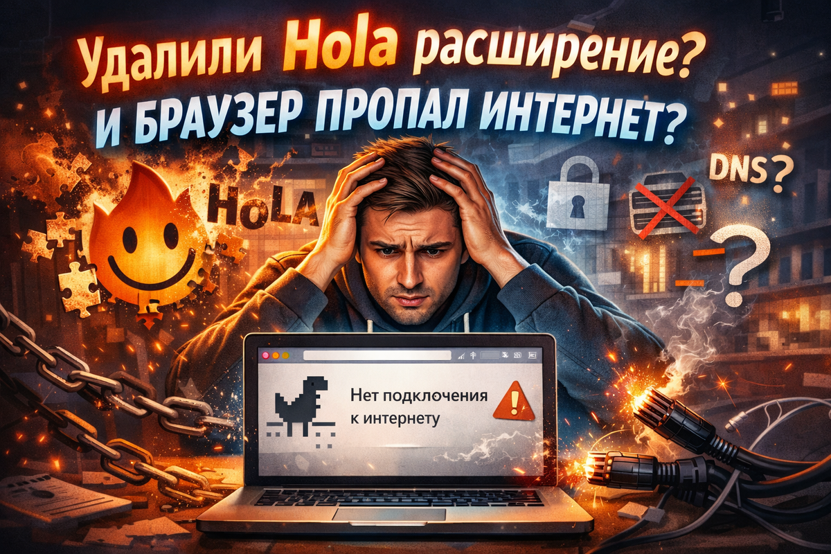 Иногда после удаления одного расширения браузер начинает вести себя странно: сайты не открываются, появляется сообщение, что нет интернета, хотя на самом деле соединение на компьютере работает нормально. Именно такая ситуация недавно произошла у одного из наших подписчиков: удалили Hola-расширение из Яндекс Браузера, а после этого сам браузер перестал выходить в сеть. На первый взгляд кажется, что проблема в интернете, но на деле чаще всего виноват не провайдер и не Wi-Fi, а остаточные сетевые настройки, которые такие расширения могут оставлять после себя. Некоторые расширения меняют параметры подключения, чтобы перенаправлять трафик через свои серверы. Даже после удаления часть этих настроек может остаться в системе. В результате браузер пытается выйти в интернет через несуществующий прокси-сервер или использует поврежденные сетевые параметры. Проще говоря: интернет есть, а браузер идет “не туда”. Чаще всего после удаления Hola в Windows остается включенный прокси. Из-за этого Браузер