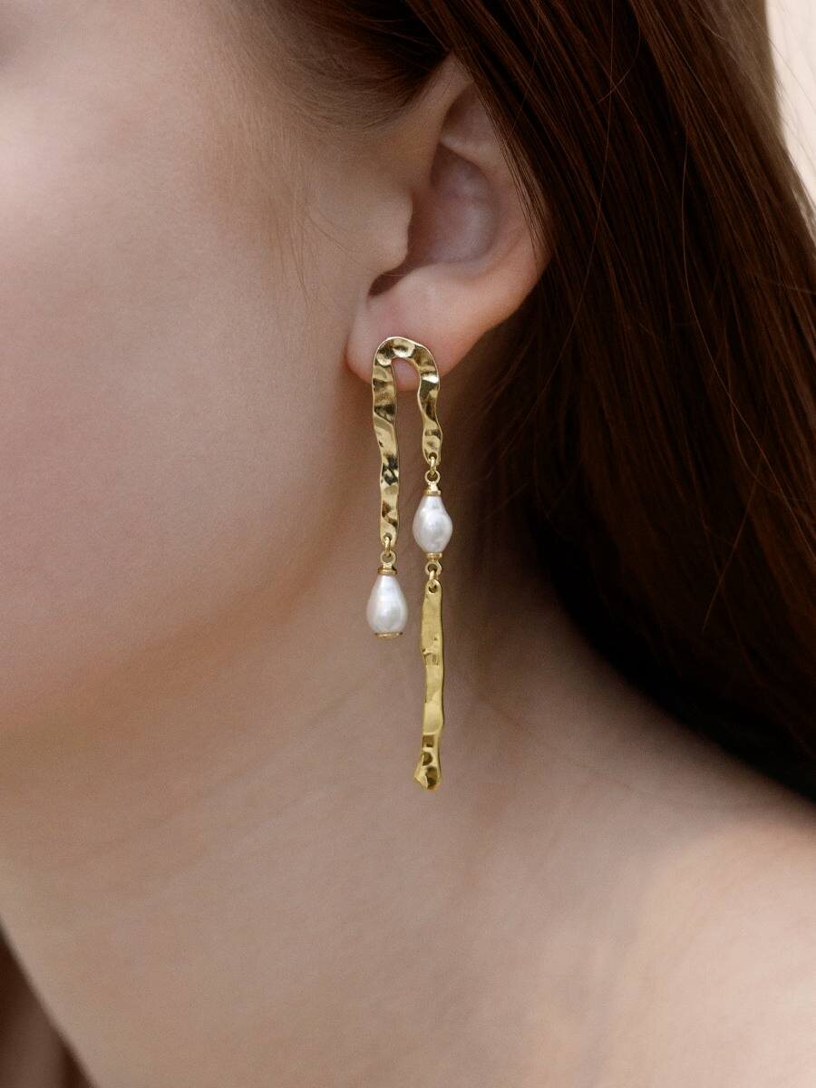 Элегантные удлиненные серьги «Мятый металл и жемчуг» - это идеальное сочетание нежного жемчуга и современного мятого металла.