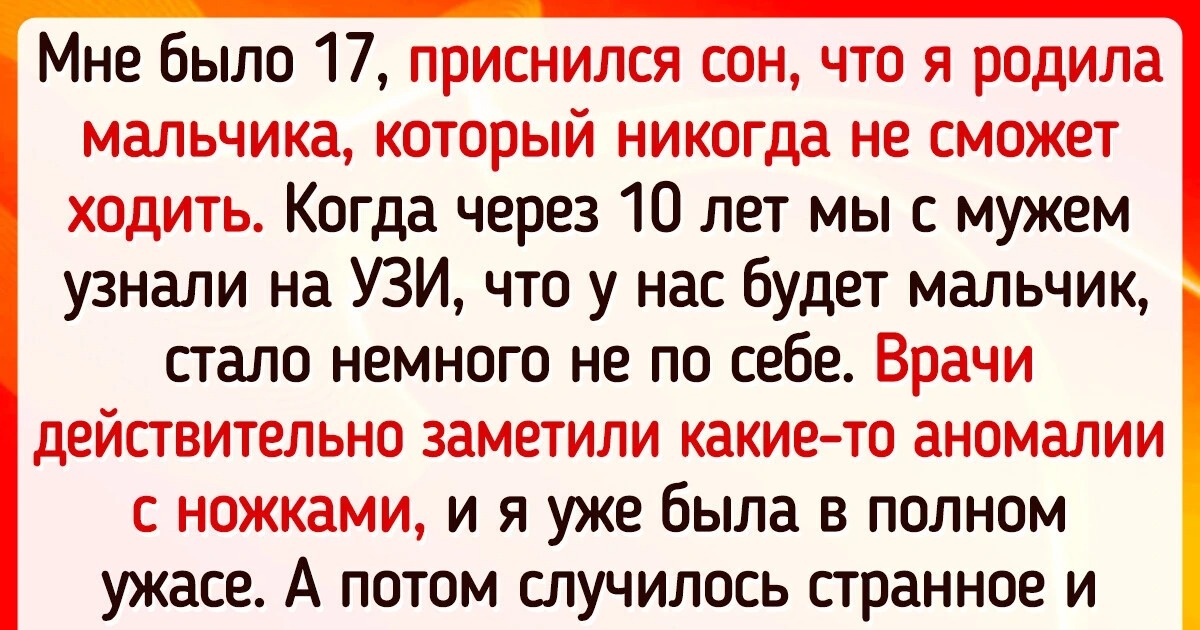 Мне было 17, приснился сон, что я родила мальчика, который никогда не сможет ходить. Когда через 10 лет мы с мужем узнали на УЗИ, что у нас будет мальчик, стало немного не по себе. Врачи действительно заметили какие-то аномалии с ножками, и я уже была в полном ужасе. А потом случилось странное: у дедушки мужа отказали ноги. Через неделю его не стало, дедушке было 92 года, поэтому все успокаивали меня, что это случайное совпадение. Наш же мальчик родился полностью здоровым, сейчас играет в футбол. Пусть все говорят, что это случайность, я же уверена, что здоровье моего ребенка — это заслуга его прадедушки.