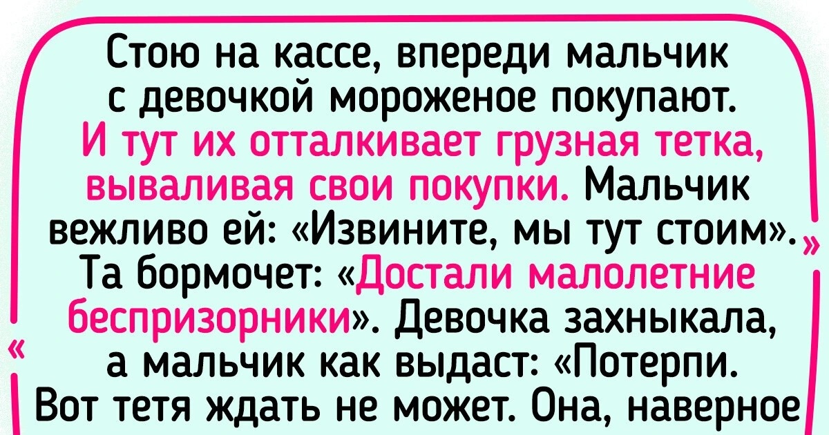Стою я с небольшим товаром в руках в очереди на кассу. Очередь медленная и длинная. Вот уже подошла к кассе почти, как передо мной влезает бабка с полной корзинкой. Я человек вообще неконфликтный, терпила, так скажем. Говорю тихонько, что я тут вообще-то стою. А она давай меня полоскать: «Мала еще спорить! Старших надо уважать и пропускать. Не учили тебя что ли, деточка?» Если бы у нее был мелкий товар, а у меня полная тележка, пропустила бы, мне не жалко. А тут наоборот: я должна буду ждать, пока она пробьет свою корзинку, найдет карточку, поругается с кассиром насчет баллов и цен, отсчитает мелочь. Ну уж нет! Сцепились мы с ней словесно, а бабка отбрехивается и уже товары на ленту начинает выкладывать. Но тут вдруг мужик, который стоял сзади меня, рявкнул на нее как следует и отправил в конец очереди. А я так не умею. © MISASUP / Pikabu