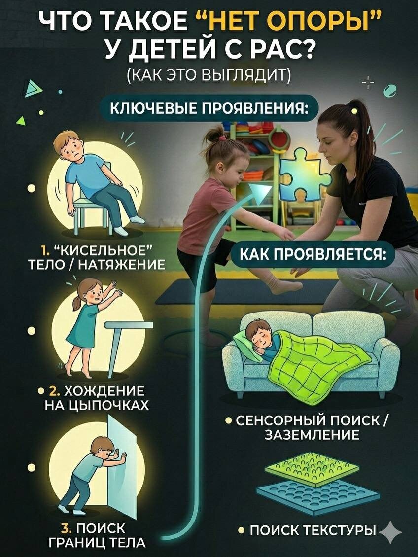 ? Часто родители детей с аутизмом слышат от специалистов фразу: «У ребенка нет опоры». Но что это значит на практике? Это не про физическую неспособность стоять на ногах, а про то, как мозг обрабатывает сигналы от тела и пространства. Если вкратце: ребенок не чувствует границ своего тела и не понимает, как «заземлиться». Вот как это проявляется в жизни: 📍 1. «Кисельное» тело или избыточное напряжение Вы можете заметить, что ребенок часто «стекает» со стула, облокачивается на стены или наваливается на вас всем весом. Ему трудно держать спину ровно — сидение без опоры для него превращается в тяжелую работу. Или наоборот: тело постоянно как струна, чтобы хоть как-то почувствовать свои границы. 📍 2. Поиск сильных ощущений (Проприоцепция) Чтобы «найти» себя в пространстве, ребенок может: • Спрыгивать с высоты на прямые ноги. • Биться спиной о диван или стены. • Сильно хлопать дверями. • Стискивать зубы или сильно сжимать кулаки. • Любить, когда его крепко «сдавливают» (объятия, тяжелое