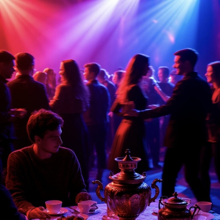Восьмое марта справляли большой, шумной компанией прямо в театральной студии. Сдвинули столы, застелили их скатертями, принесли всяких вкусностей. Даже где-то раздобыли большой, настоящий самовар.