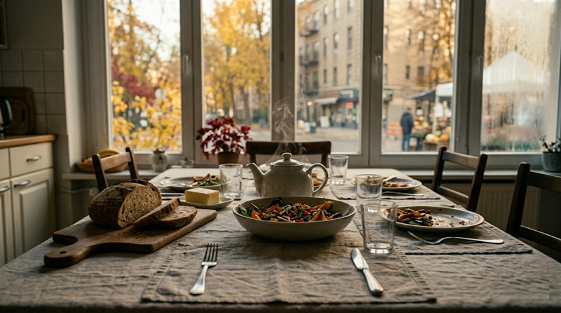 Дома Людмила накрыла на стол — быстро, привычно. Салаты она сделала с утра, оставалось только нарезать хлеб и достать из холодильника. Дети сидели на кухне, говорили о чём-то своём — она слышала обрывки, не вслушивалась. Расставляла тарелки и думала о том, что стол теперь всегда кажется большим — даже когда приходят гости, даже когда все сидят. Раньше он был в самый раз.