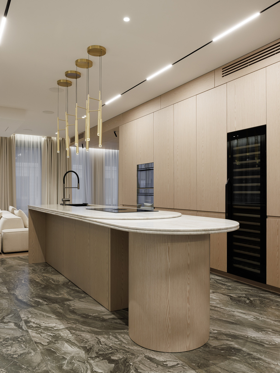 Кухня реализована в современном минималистичном стиле с акцентом на чистую архитектуру и цельность объёмов. Все фасады выполнены без лишних деталей, а основным материалом стал натуральный шпон светлого оттенка, который формирует спокойное и выверенное пространство. Одним из ключевых элементов композиции стал остров с радиусными формами. Скруглённая опора и плавная линия столешницы отражают актуальный тренд на мягкую геометрию и делают крупный объём визуально легче. Радиусные элементы также повышают удобство использования и добавляют интерьеру более пластичный, современный характер. Особое внимание мы уделили минимализму и системам скрытого хранения. В кухне отсутствуют открытые полки и витрины — вся функциональность скрыта за ровными фасадами. Такое решение делает интерьер более спокойным, практичным в эксплуатации и визуально аккуратным. Фото: Иван Сорокин
