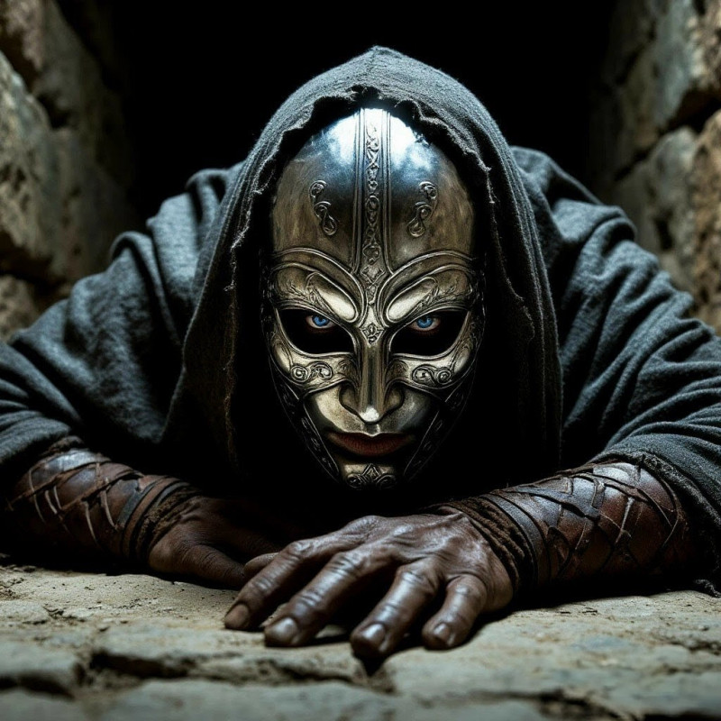 Подойдя к алтарю, Мельхар и Айсад обнаружили, наконец, колдуна, вернее то, что от него осталось. Вся нижняя часть тела волшебника вместе с ногами отсутствовала, уцелевшая половинка лежала в успевшей загустеть луже крови и омерзительных клочьях пережёванной плоти. Но самым страшным оказалось то, что колдун всё ещё продолжал жить – пальцы царапали пол, пытаясь уцепиться за едва заметные шероховатости камня. Судя по извилистому склизкому следу, колдуну удалось таким образом проползти около сажени. Когда Мельхар и Скадербек приблизились, раненый кудесник с трудом повернул в их сторону голову, и стало видно, что на лице у него надета серебристая маска с драгоценными камнями на месте глаз. Скадербеку Айсаду эта маска объяснила сразу очень многое.