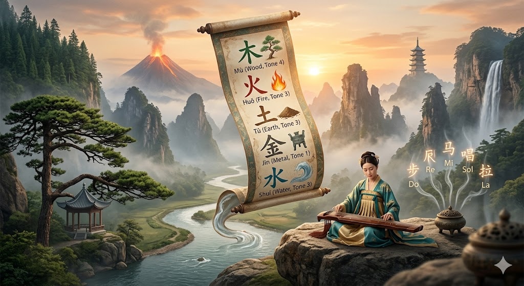 5 ступеней звукоряда соответствуют 5 стихиям природы, 5 сторонам света и 5 тонам китайского языка.