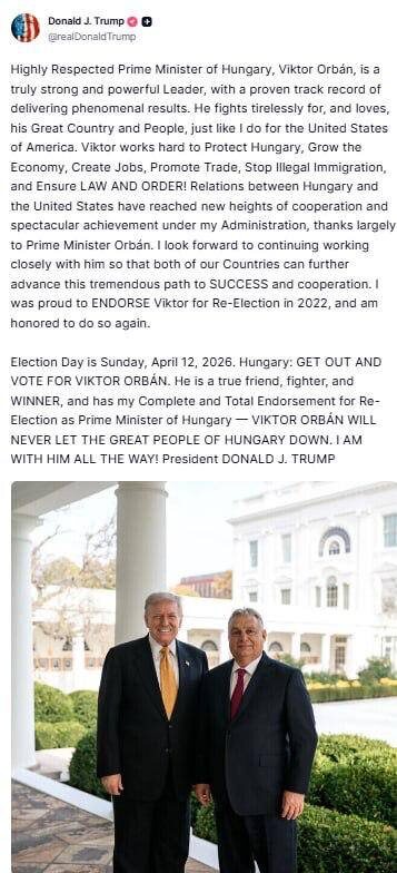 Дональд Трамп выступил с призывом поддержать премьер-министра Венгрии Виктора Орбана на предстоящих в воскресенье выборах. Президент США охарактеризовал Орбана как «сильного и могущественного лидера» с высокими результатами работы. Трамп отметил, что венгерский премьер отстаивает интересы своей страны и народа, проводя параллель со своей политикой в Соединенных Штатах. Также он подчеркнул, что благодаря Орбану между США и Венгрией сложились конструктивные отношения.