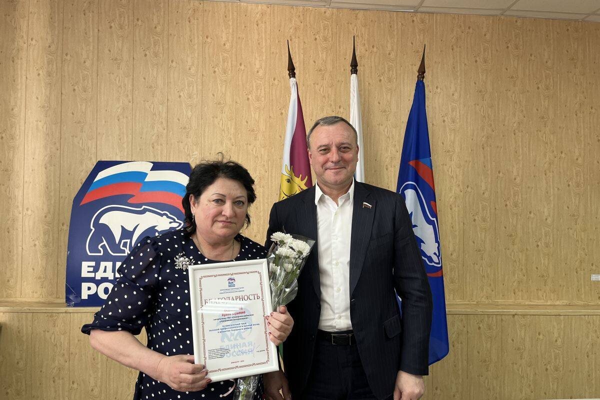 🔹Секретарь Регионального отделения Единой России, депутат Госдумы поблагодарил Ирину Андюкаеву за помощь фронту. 🔹Начальник районного управления ветеринарии Ирина Андюкаева – постоянный инициатор волонтерского движения в Северном районе. По ее словам, здесь живут одни из самых отзывчивых жителей. 🔹Сбор гуманитарной помощи при поддержке главы муниципального образования, Секретаря местного отделения Единой России Михаила Журкина был организован после начала спецоперации в 2022-м году. Всего волонтерских объединений на территории района три. Причем одно из них – это школьники, которые помогают по хозяйству мамам и женам бойцов, а еще есть «Северный район – фронту» и «Своих не бросаем». 🔹В их работе задействованы все сельсоветы. Жители плетут маскировочные сети, фасуют чай, готовят лапшу и супы быстрого приготовления, экипируют военнослужащих, отправляющихся на фронт, отправляют гумгрузы. Как раз вчера на передовую ушел 188-й по счету. В праздник светлой Пасхи жители передали бойцам