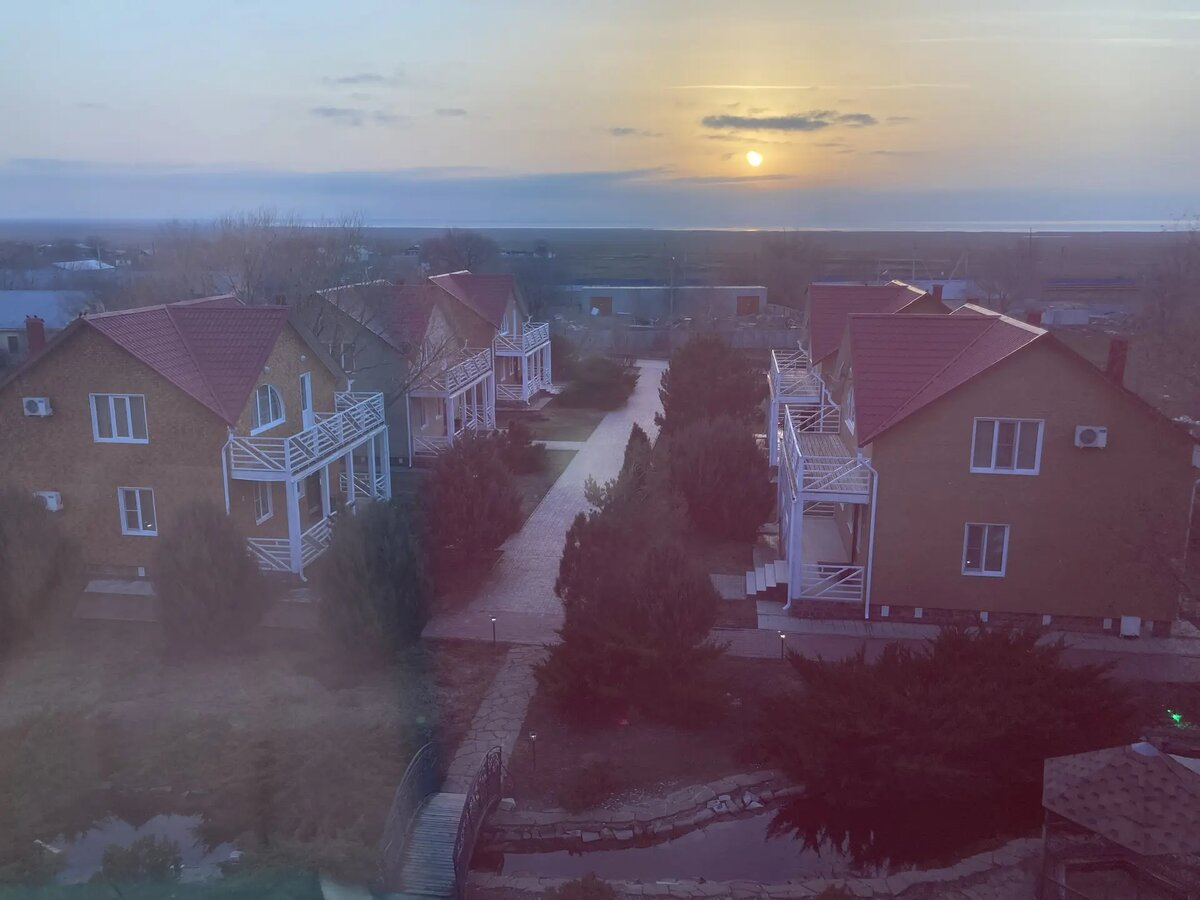 Сверху мы с Иринкой вообще-то не "коттеджный поселок" рассматривали, с 4 этажа гостиницы. Мы ловили закат, потому что закаты тут офигенские! С закатами нам как-то не везло. Солнце садилось не за горизонт, как хотелось нам, а в полоску облаков на горизонте. Ну, зато видно, как располагается этот коттеджный посёлок. Хоть и плохо видно, конечно.