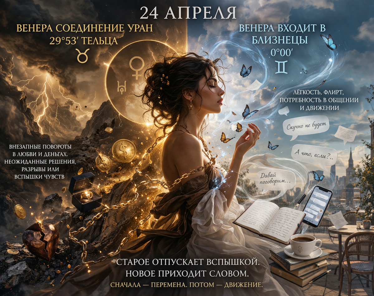 24 апреля складывается редкая и очень показательная астрологическая сцена, в которой сначала происходит соединение Венеры с Ураном в последних градусах Тельца, а сразу вслед за этим Венера переходит в Близнецы. И вот здесь начинается самое интересное, потому что речь идёт не просто о событии в небе, а о смене внутреннего режима, в котором человек переживает ценность, привязанность, симпатию, удовольствие, выбор, деньги, желание близости и сам способ связываться с жизнью. Венера в астрологии — это не только про любовь в привычном бытовом смысле, не только про отношения, красоту и приятные эмоции, как это часто подают в упрощённых трактовках. Венера показывает, как человек определяет для себя, что для него ценно, чего он хочет не на уровне долга, а на уровне естественного притяжения, к чему тянется тело, куда идёт внимание, ради чего хочется открываться, принимать, впускать, сохранять, украшать и удерживать. Это очень глубокая функция психики, потому что именно через Венеру человек отвечает на один из самых важных вопросов своей жизни: что для меня имеет настоящую ценность и почему я выбираю именно это. Когда к Венере прикасается Уран, привычная система предпочтений начинает дрожать. Уран не спрашивает, готов ли человек к переменам, он не действует мягко и поэтапно, он вскрывает то, что уже давно стало тесным, мёртвым, предсказуемым, автоматическим. Поэтому соединение Венеры и Урана почти всегда связано с внезапным прозрением в любви, в деньгах, в теме самоценности, в эстетике, в телесном отклике, в личных вкусах и в отношениях с комфортом. Это может проигрываться как мгновенная влюблённость, неожиданное охлаждение, резкое решение выйти из отношений, нестандартное знакомство, обнуление прежней финансовой модели, импульсивная трата, внезапная возможность, тяга к свободе, сильное желание перестать жить так, как было удобно, но давно уже не по-настоящему. Уран никогда не ломает просто ради хаоса. Он ломает то, что было слишком неподвижным, слишком контролируемым, слишком построенным на страхе потерять стабильность.