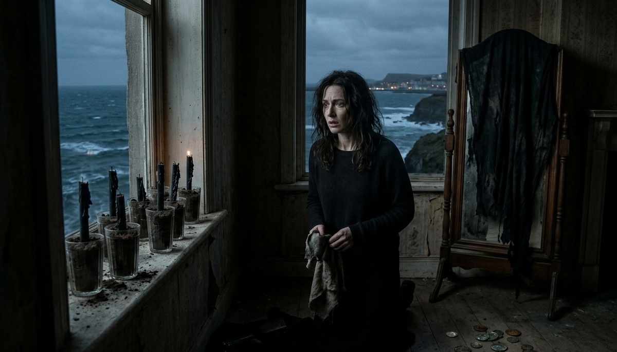 Она уехала в сумерках, не оглядываясь. Когда я вошла в дом с тряпкой и ведрами, первая же комната заставила меня похолодеть. На подоконнике в ряд стояли стаканы, туго набитые черной могильной землей. В центр каждого были воткнуты оплавленные церковные свечи, скрученные по две. Напротив стояло массивное зеркало, занавешенное старым, пахнущим тленом бархатом.