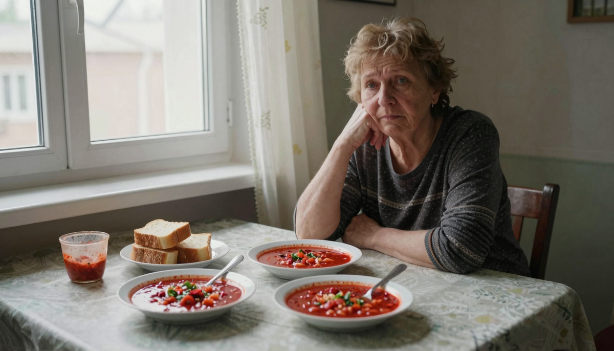 Анна сварила его с утра, как всегда — свёклу запекла отдельно, чтобы цвет держался. Порезала хлеб. Достала тарелки — четыре штуки, как тридцать лет подряд. Поставила на стол солонку, которую Данил в детстве называл «белой башенкой».