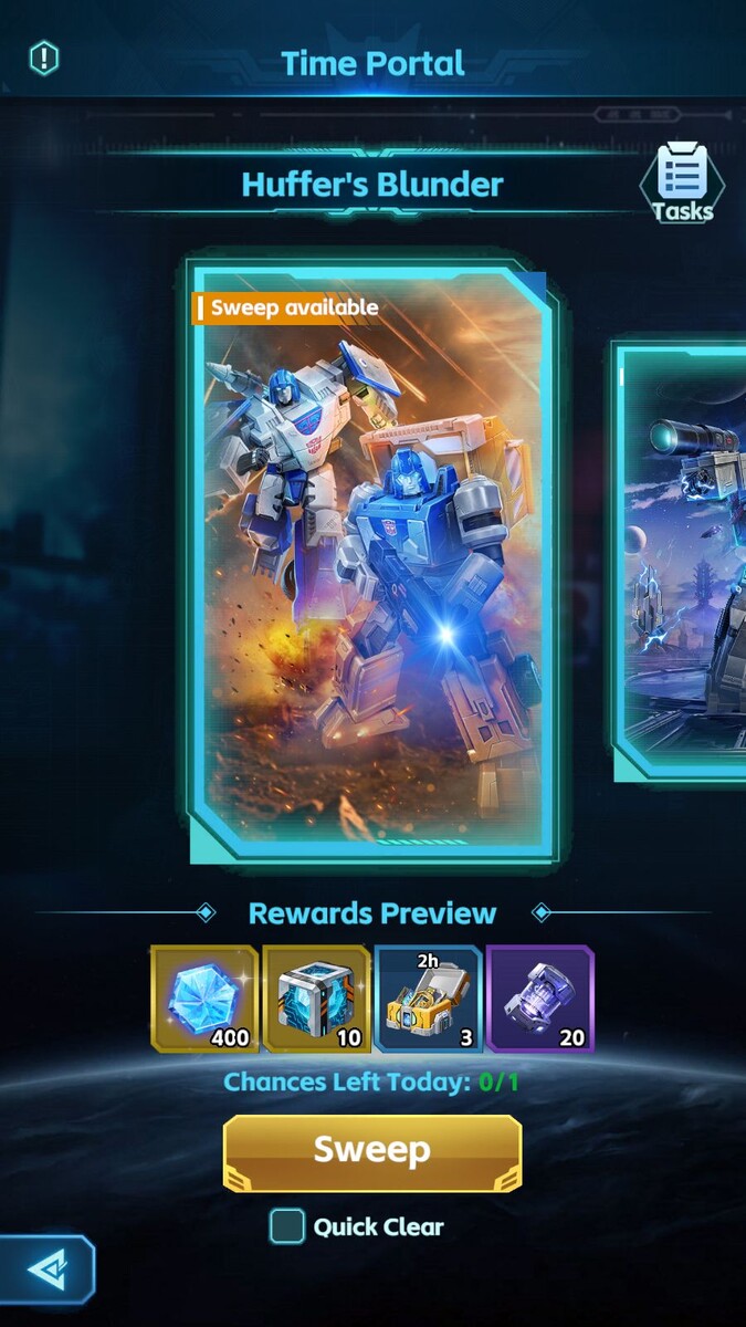 Временной портал - это ещё один режим игры, обладающий собственным сюжетом. Он представляет две истории сражения автоботов и десептиконов с легионом хаоса. Сюжеты, да и сам формат, совершенно не изменились за год, прошедший с предыдущего теста. Первая история называется "Huffer's Blunder", т.е. "Промах Хаффера". Вскоре после создания альянса автоботов и десептиконов Оптимус Прайм посылает Хаффера и Миража на обследование аномальных энергетических сигналов в юго-западной пустыне, разведать активность легиона хаоса, но в бой не вступать. Хаффер закономерно удивляется назначению в отряд, зато Мираж очень доволен получить задание, где ему не придётся сражаться. Уже на месте инженер начинает причитать и вспоминает, как на прошлой миссии "навыки" разведчика чуть не стоили им жизни. Мираж напоминает, что именно Хаффер вызвал тревогу, а его голограммы сработали на славу, после чего становится невидимым. Наконец, автоботы пробираются к вражеской базе, и несмотря на предупреждение Миража, Хаффер