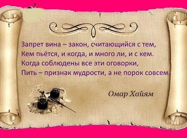 Вспомним, что Коран запрещал вино.. . здесь же это бунт против Корана, против святош, против подавления природы и разума религиозным законом. Пьющий для поэта — символ освободившегося человека, попирающего каноны религии» , писал о поэзии Омара Хайяма французский ориенталист Дж. Дермстетер.
