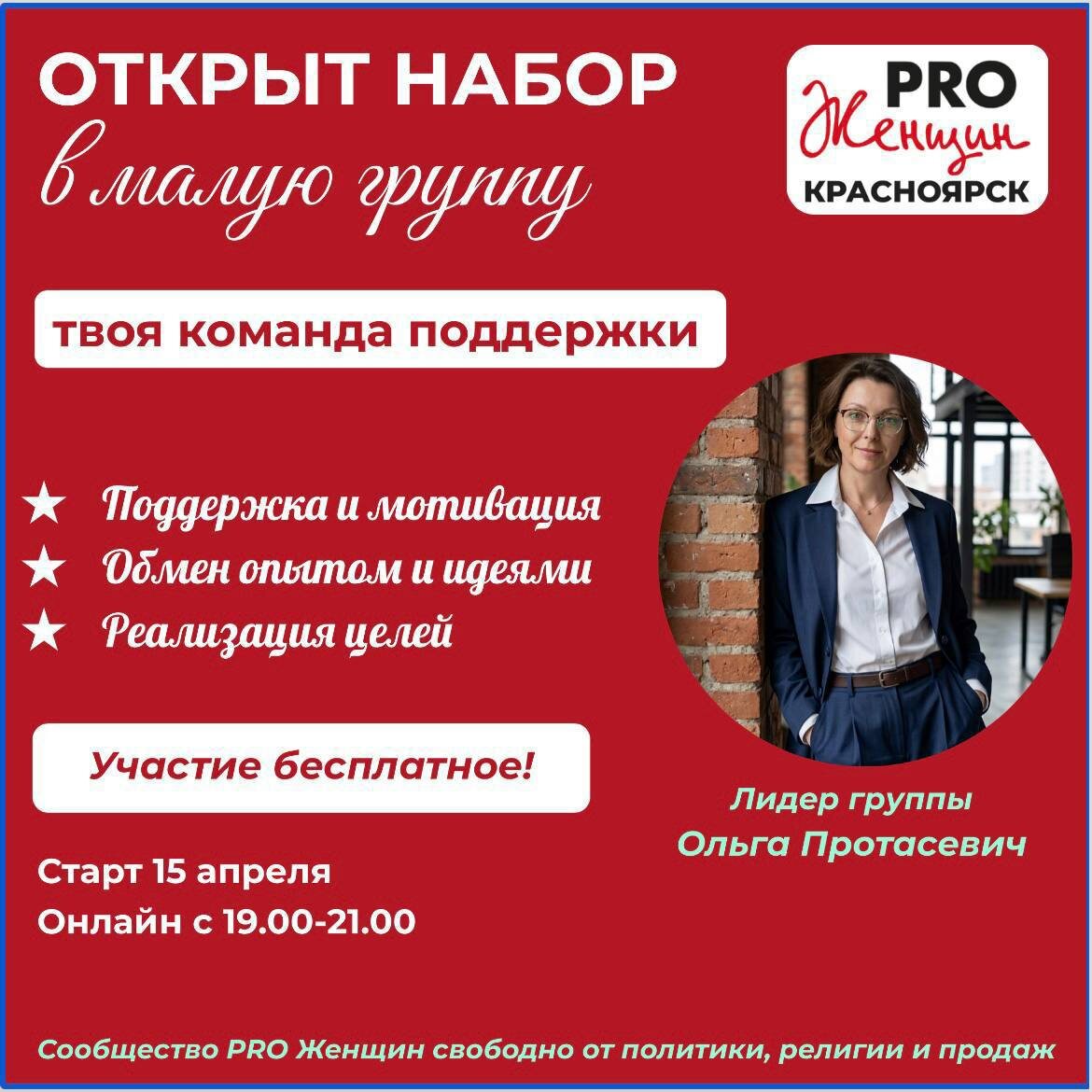 Ольги Протасевич «ТВОЯ КОМАНДА ПОДДЕРЖКИ😘» 🤑Твоя цель 🤑Твое окружение🤑Твоя поддержка Эта группа для тебя, если: 🤕есть мечта, цель, но страшно начать 🤕внутри «что-то есть», но ты не знаешь, как это развернуть, 🤕хочется, чтобы кто-то был рядом не из жалости, а из веры в тебя 🤕нужен взгляд со стороны и подсказки, проверенные опытом. Я приглашаю тебя в малую группу по методологии 😁 Что мы будем делать: 🤭честно говорить о том, чего хочется на самом деле 🤭искать не ошибки, а ресурс 🤭ставить цели и идти к ним 🤭помогать друг другу не бросать начатое на полпути Формат: малая группа (до 6 женщин), встречи на протяжении 8 недель. 🥳Старт: 15 апреля ( по средам ) 😟Онлайн 😶с 19.00-20.00 Крск. Не откладывай себя на потом, присоединяйся! Пиши мне 🥰@olga_protasevich И иди к своим целям в «Твоей команде поддержки»😘 😓Важно: участие безоплатно. Мы не обсуждаем политику, здесь нет религии и ничего не продается. ❤️ Поделитесь постом, нажав маленькую стрелочку справа ➡️ https://pr