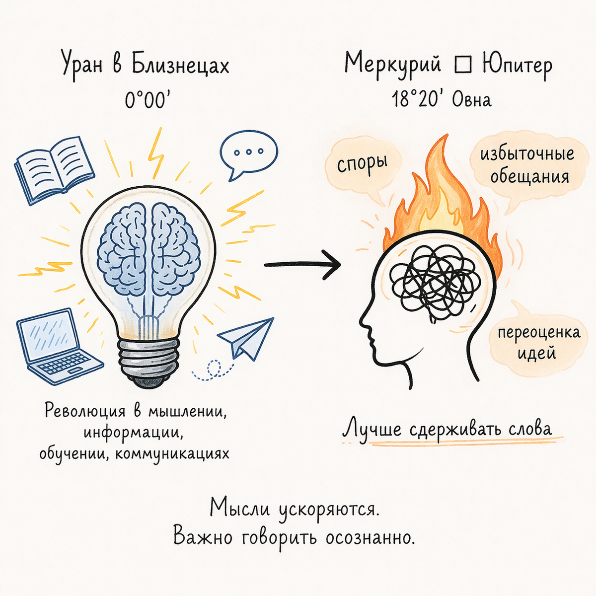 Один и тот же день может принести одному человеку поворот в отношениях, другому — нервный карьерный перелом, третьему — кризис прежней системы ценностей, четвёртому — интеллектуальное освобождение, пятому — обострение в теме дома и семьи, и именно здесь становится очевидно, насколько поверхностны любые общие трактовки без домовой логики. Уран в Близнецах действительно запускает эпоху революций в мышлении, информации, обучении и коммуникациях, но в личной карте эта воздушная молния всегда бьёт в конкретную сферу, где человеку уже тесно, душно, устарело и внутренне неправда. Меркурий в квадрате к Юпитеру в этот день показывает, как легко на переломе эпохи поддаться избыточности, спутать масштаб мысли с её зрелостью, сказать лишнее, пообещать лишнее, поверить в первую вспышку как в окончательный ответ. И именно поэтому глубокий астрологический разбор никогда не может строиться только на знаке. Знак задаёт стиль, но систему жизненных акцентов меняет расположение сфер, их связи, напряжения, пересечения и скрытая логика карты. Если вы хотите понять, где именно этот переход включит ваши личные сценарии, через какую сферу пойдёт освобождение, где будет нервное напряжение, в чём ваши сильные стороны, где вас может унести в поспешность, в спор, в переоценку и как использовать этот период не хаотично, а точно, это уже задача не общего текста, а индивидуального разбора.