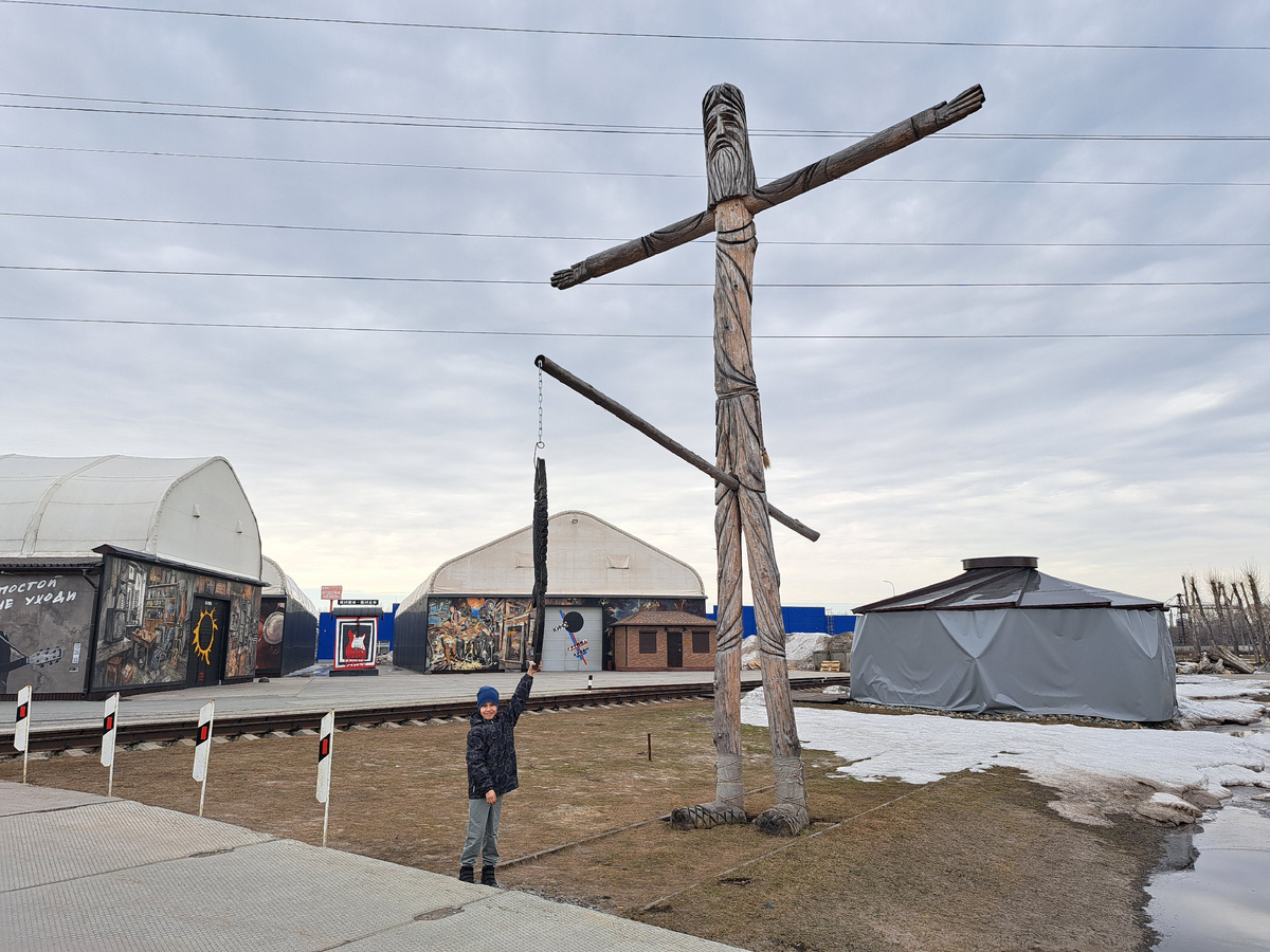 Не перестаю удивляться тому, как облагораживают территорию «Левобережки», ведь это, по сути, промзона, и здесь, казалось бы, нет места для подобного. Каждый раз мы находим для себя что-то новое и интересное. Скульптуры расставлены повсюду. Вот — «бронзовый» мальчик, играющий в городки. На шее у него нынче повязан красный галстук. Рядом, будто из музейных экспонатов, сооружён необычный горшок. Летом тут появятся цветы. Вы только обратите внимание на эти великолепные утюги с лапками! А как вам новые деревянные персонажи у барной стойки? А зубастая девочка? Дворник с метлой занял место мальчишки с вертолётом. Яркости пеньков позавидует радуга. А пара бобров желает всем добра — кто бы сомневался. В небольших разноцветных строениях у железной дороги наверняка прячется что-то интересное. Вдалеке виднеются три головы Горыныча. А рядом «плещутся» деревянные волны. Возвышается над всем этим длинный деревянный идол. По некоторым данным, это не кто иной, как Дед Щукарь. На удочке, уст