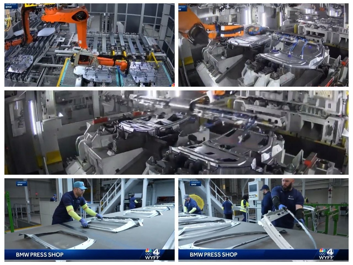Чудом наткнулся на удивительный и никому не известный видеоролик - сюжет провинциального телевидения штата Южная Каролина о запуске первого прессового производства BMW в Северной Америке... в котором можно увидеть уникальную технологию штамповки воочию. Мы видим штамповку на высокоскоростной XL прессовой линии сразу четырёх рамок дверей конкретного автомобиля (предположительно модели BMW X3) из двух заготовок. Привычным для нас процессом является штамповка «сдвоенных» рамок (передних и задних) - в одном потоке две передние, в другом две задние. Тут же штампуются все четыре за один удар. Сама идея не нова: например, мы видели, что таким же образом получают «лицевые» панели дверей Audi на венгерском заводе в Дьёре. Однако наружные панели штамповать таким способом всё же более рискованно: сортировать и выравнивать стоки в случае брака по лицевым дефектам и накладно, и не целесообразно. А вот для структурных деталей такой подход к многоручьевым штампам выглядит весьма рационально - и в