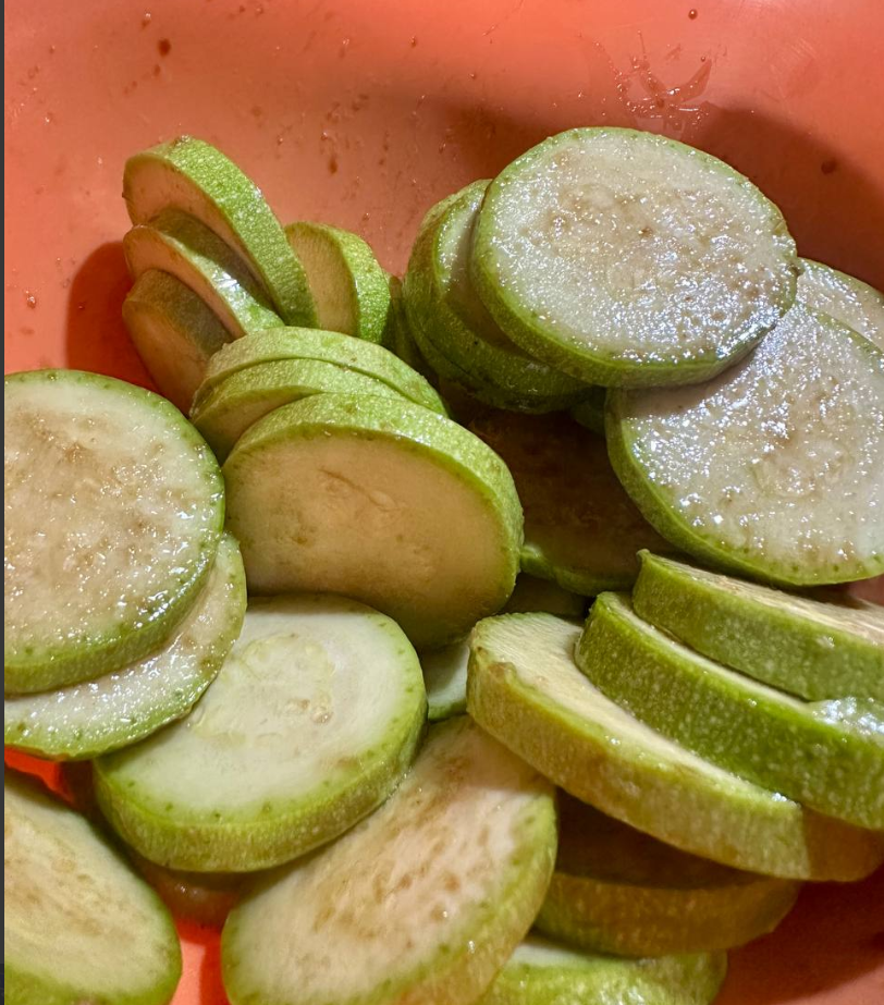 • По желанию: чёрный перец. 👩🍳 Как готовим (всё просто и быстро!): 1️⃣ Подготовка: Кабачок помойте. Если кожура тонкая и нежная — оставляйте, если чуть грубовата — можно частично очистить. Нарежьте кружочками толщиной ~0,5–1 см.