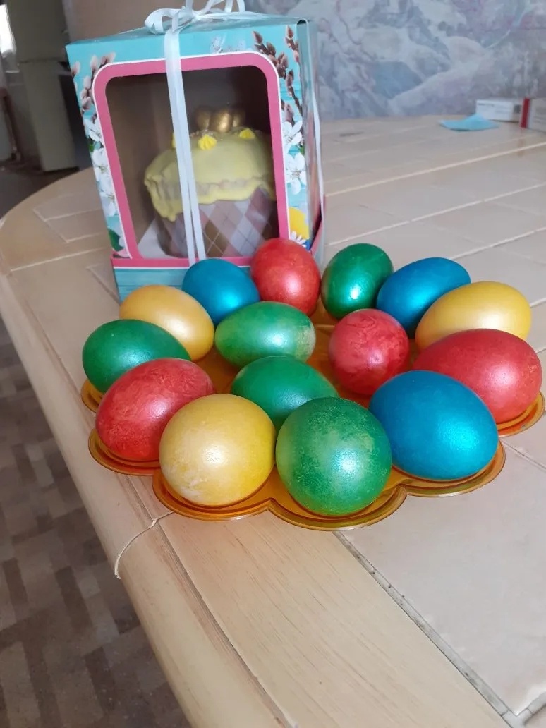 Надо было видеть её растерянное и испуганное лицо в этот момент. Я со смехом начинаю ей рассказывать эту историю, что ребёнку сильно хотелось разноцветные яйца именно сегодня, и мы решили не дожидаясь Пасхи покрасить сегодня, а потом ещё раз.
