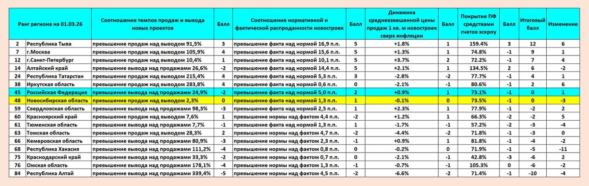 ЕРЗ.РФ опубликовал рейтинг устойчивости рынка новостроек по регионам России на 1 марта 2026 года. Итоговый балл рейтинга рассчитывается на основании: ✔️соотношения темпов продаж и вывода новых проектов; ✔️фактической распроданности по строящимся жилым комплексам в регионах; ✔️динамики цен на новостройки сверх текущей инфляции и уровня покрытия проектного финансирования средствами эскроу-счетов. ▪️С ноября 2025 года в Новосибирской области не улучшились показатели ни по одному из этих параметров: ✔️Соотношение между продажами и выводом новых проектов уменьшилось на 35%; ✔️Соотношение нормативной и фактической распроданности новостроек уменьшилось на 0.4 п.п.; ✔️Динамика средневзвешенной цены продаж 1 м2 новостроек сверх инфляции (ДСЦ) стала отрицательной; ✔️Покрытие проектного финансирования средствами счетов эскроу снизилось с 74,9% до 73,5%. В результате итоговый балл за 4 месяца в Новосибирской области снизился на 3 единицы — с 3-х до 0. В рейтинге регионов Новосибирская о