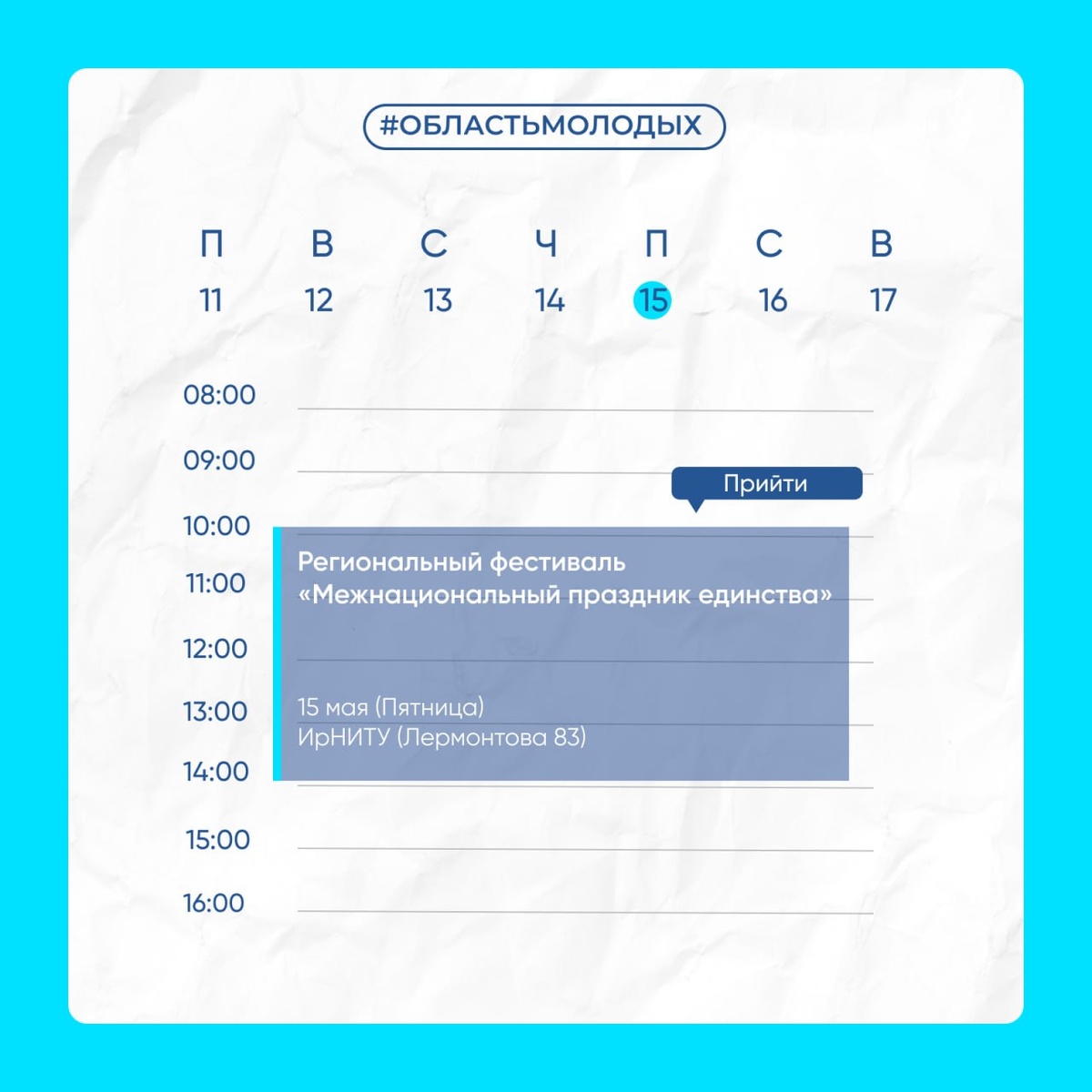 ! 15 мая в ИРНИТУ пройдет Региональный фестиваль «Межнациональный праздник единства» — событие, где встречаются культуры и друзья! Собирай команду минимум из 4 человек и присоединяйся! Важно: участвовать могут иностранные и российские студенты. Что вас ждет на фестивале? Каждая команда сможет выбрать один из трех блоков, чтобы представить свою культуру: ➡️ Традиционные спортивные игры — командные соревнования по мотивам национальных игр; ➡️ Творческий блок — концерт с национальными танцами, дефиле в этнических костюмах и выставка народных ремесел; ➡️ Национальная кухня — интерактивная дегустация блюд, приготовленных участниками; ➡️ Мастер-классы — площадка с творческими мастерскими, где можно попробовать свои силы в различных ремеслах. 📎 Для участия необходимо зарегистрироваться по ссылке до 24 апреля. Погружайся в культуру и знакомься с новыми людьми!🫂 Проект реализуется в рамках комплексной программы «Код сибирской молодежи», поддержанной «Росмолодёжь.Гранты» во Всероссийском