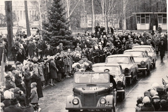Сначала он побывал в Снежинске, а потом у нас тут встречался с руководством, с общественность, выступал перед горожанами. Это было потрясающее событие. Почти все кто не на работе и не в отъезде, вышли тогда на улицы встречать известного космонавта по всему маршруту его передвижения - улица Гагарина -улица Новая -улица Колыванова -проспект Ленина, Советская площадь, площадь Ленина.