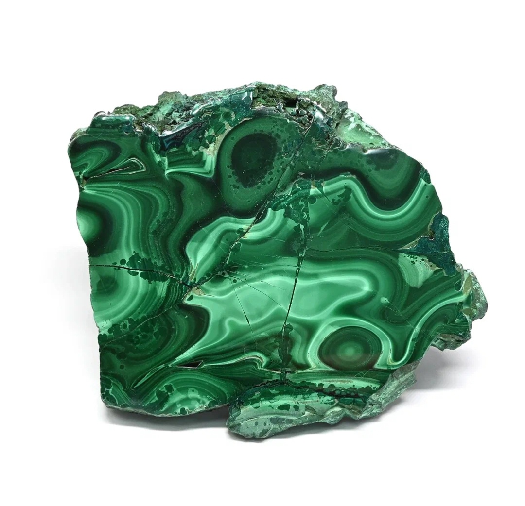 Главная особенность малахита — его рисунок. Концентрические круги, ленты, почковидные формы, переливающиеся от светло-зелёного до тёмно-изумрудного. В разрезе малахит напоминает годовые кольца дерева или рябь на воде. Чем больше кругов и чем тоньше полоски, тем ценнее камень.