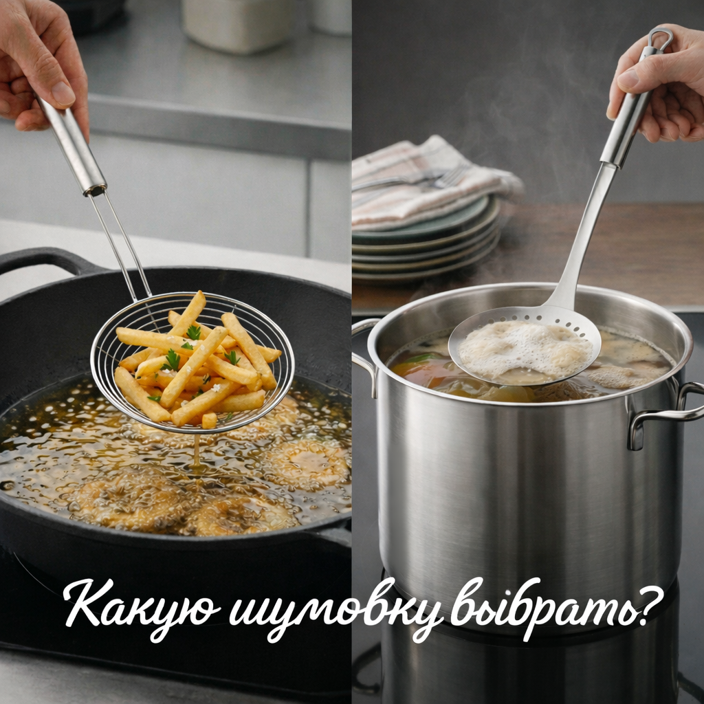 Казалось бы, шумовка — простейший кухонный инструмент. Дырки есть, ручка есть, что ещё надо? Но попробуйте один раз использовать правильный инструмент по назначению — и всё станет на своё место. Смотрите сами. Паутинка — та, что с проволочной сеткой — это про скорость и высокие температуры. Фритюр, вок, бланширование. Опустил в кипящее масло, поднял — и моментально стекло. Пончики не плавают в жиру лишние секунды, картошка не пригорает и получается идеальной, без лишнего масла. А ещё такая шумовка отлично держит форму продукта — нежные равиоли или клёцки не помнутся и не развалятся по дороге из кастрюли в тарелку. Классическая шумовка с округлой чашей — это уже другое настроение. Неторопливое, домашнее. Пельмени, овощи из супа, пена с бульона — всё, где важна не скорость, а аккуратность. Небольшие бортики чаши не дадут продуктам соскользнуть обратно в кастрюлю в самый ответственный момент, а мелкие отверстия удержат даже небольшие кусочки. Если основа вашей кухни обычные домашние блюда