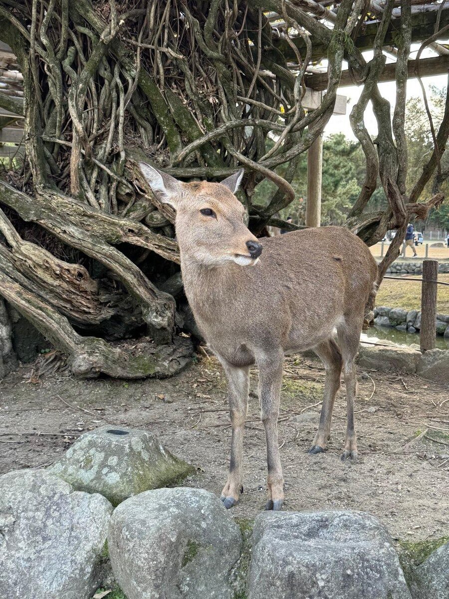 ? Олень конечно же святой, ведь он лягает детей и даёт себя погладить взрослым! Но вроде это не единственная причина широкого распространения оленей в Японии. Есть несколько мест, где можно потрогать оленей. Самое попсовое — Нара. Мы как раз туда и ездили, потому что это самое удобное расположение относительно других мест. Обычной электричкой рано утром мы отправились из Осаки в Нару. Вообще остановиться именно в Осаке самый разумный и экономичный способ побывать во всех туристических местах, потому что отели тут недорогие, а добраться на электричках можно куда угодно за час с небольшим. В том же Киото цены за традиционные отели (спать на футоне 🤮) улетают в космос за пару ночей. Так у нас получился маршрут за ОДИН день «Осака – Нара – Киото – Осака». Мы были наслышаны о толпах людей в Наре и замученных оленях, но на самом деле всё оказалось не так страшно. Людей было не так много, потому что мы были в «несезон», но вообще-то осень тот ещё сезон, так как начинается цветение клёнов