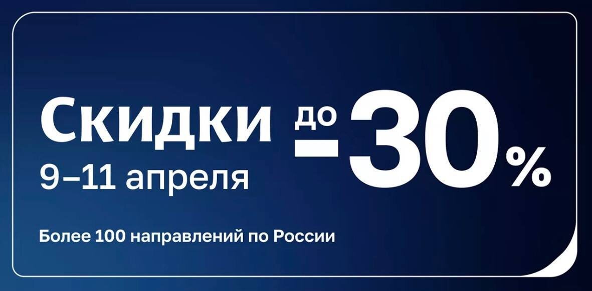 % 🔗 Только 2 дня: с 10 по 11 апреля — распродажа на перелёты по России. В акции участвуют даже даты на майские праздники. Примеры цен: 🔗 Москва — Сочи от 6 046 ₽ 🔗 Санкт-Петербург — Калининград от 5 761 ₽ 🔗 Москва — Санкт-Петербург от 3 808 ₽ Количество билетов по акции ограничено. Такие цены быстро заканчиваются.