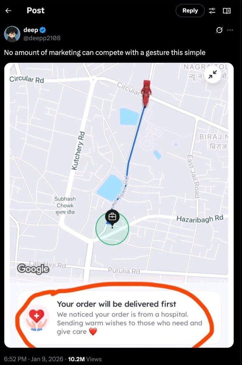 Увидел кейс из Индии у Blinkit. Механика максимально простая: если система понимает, что заказ везут в больницу, его ставят в приоритет и пишут человеку: «Заметили, что вы в больнице. Передаём тёплые пожелания тем, кто нуждается в заботе — и тем, кто её оказывает ❤️» С точки зрения продукта это редкий момент, когда ценность не в «фиче», а в контексте. Там, где вы обычно пытаетесь продавить эмоцию скидкой или пушем, работает уважение к ситуации пользователя. И да, на внедрение это стоит почти ничего: событие, правило, короткий текст. А эффект — репутация и лояльность, которые не покупаются промокодами. И тут мой любимый контраст с ИИ: он может сгенерировать тысячу вариантов сообщений, но не умеет почувствовать момент. Цепляет не «красивый копирайтинг», а то, что продукт вовремя промолчал про продажи и сказал по-человечески. Я бы искал в своём продукте эти 5–10 секунд, где вы можете сделать шаг навстречу, не требуя ничего взамен. Именно это запоминают 👨💻Продакт поехал #product